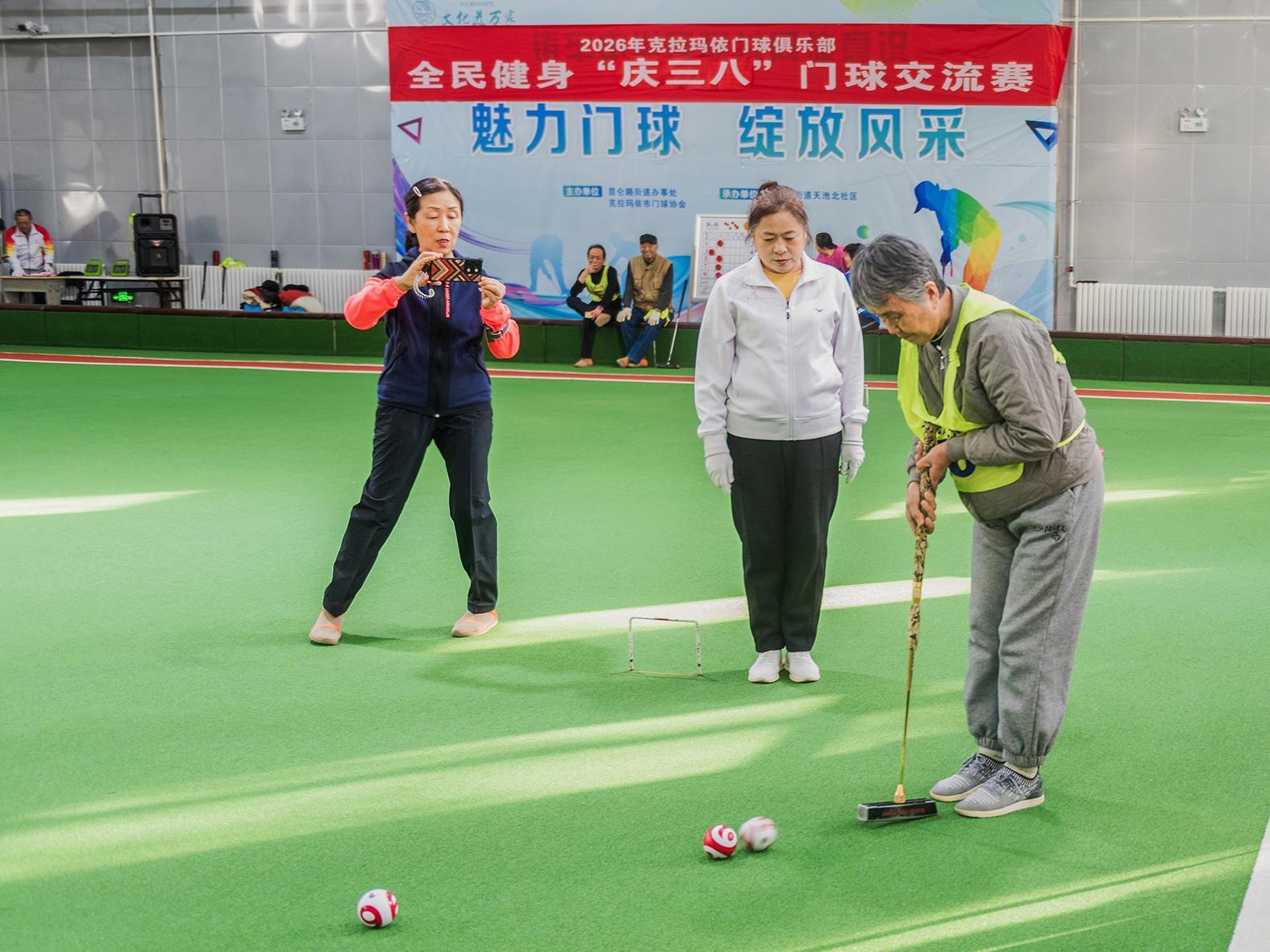 3月7日,克拉玛依区天池北社区门球馆内,克拉玛依门球俱乐部在此举办全民健身“庆三八”门球交流赛。本次活动旨在丰富女性的文化生活,增强团队凝聚力。来自克拉玛依区、白碱滩区的14支代表队在此一决高下。
