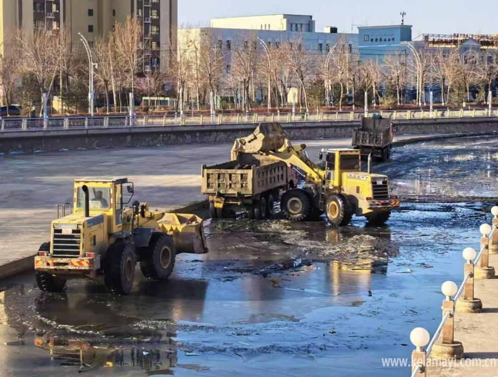 3月15日清晨,克拉玛依中心河景区,工程车辆正在给河道清淤。