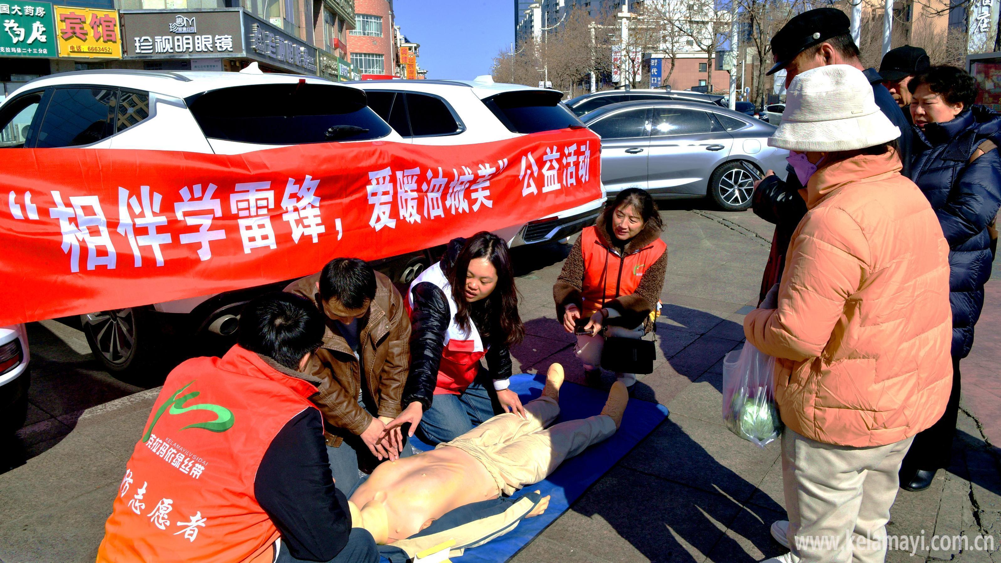 3月14日,克拉玛依绿丝带志愿者在市区街头为市民培训急救技能。